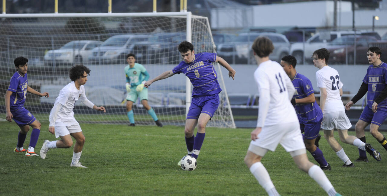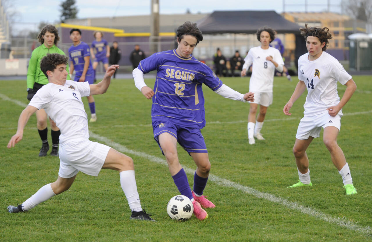 Sequim’s Joshua Alcaraz, center, tries to keep possession as he’s surrounded by Bainbridge players in the Wolves’ home game against the Spartans on March 26.