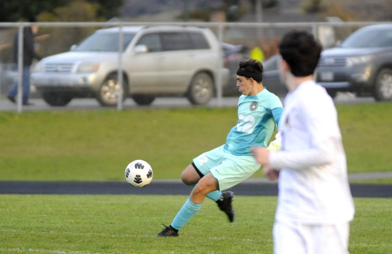 Sequim Gazette photo by Michael Dashiell / Sequim goalkeeper Nolan Valenzuela boots the ball downfield in the first half of SHS’s 3-2 loss to visiting Bainbridge on March 26.