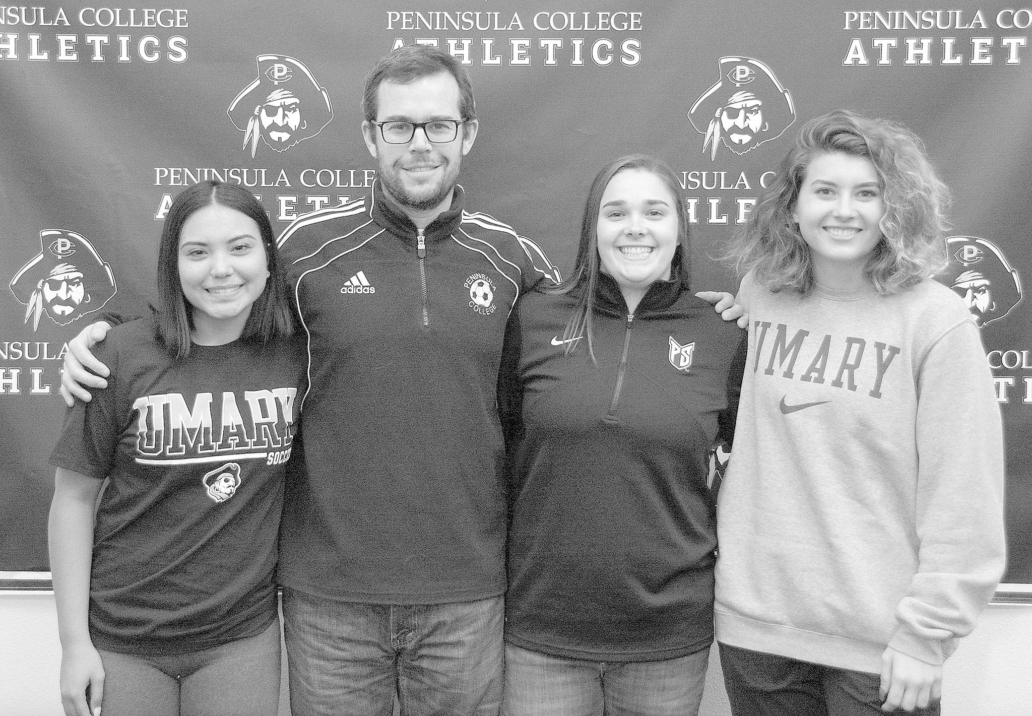 Peninsula College women’s soccer players (from left) Kayla Alcott, Sam Oliveira and Halle Nottage were joined by head coach Kanyon Anderson at a signing ceremony on Jan. 24. The three players will move on to play at four-year schools next fall. Submitted photo