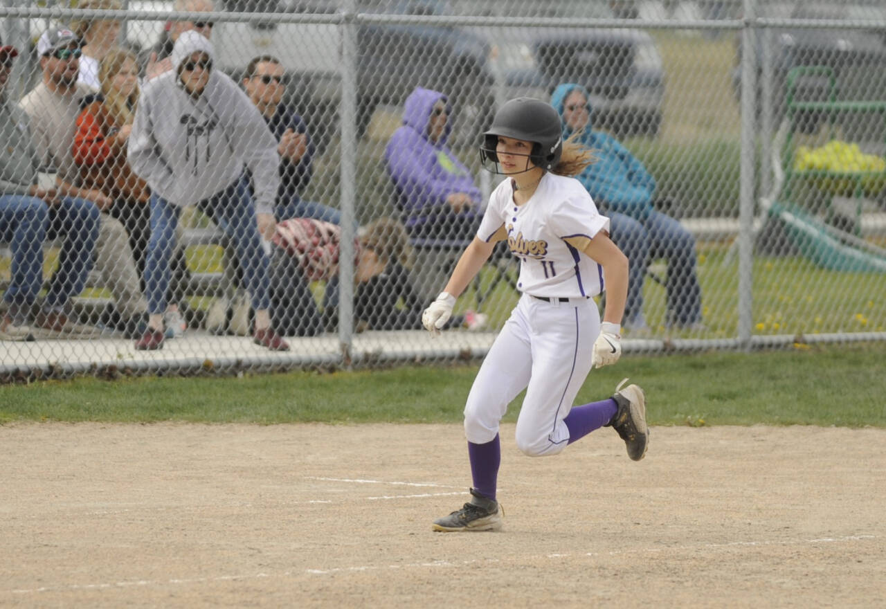 Sequim Gazette photo by Michael Dashiell / Sequim's Kylie Winters races home for a score in the second inning as the Wolves take on 1A Klahowya on April 20.