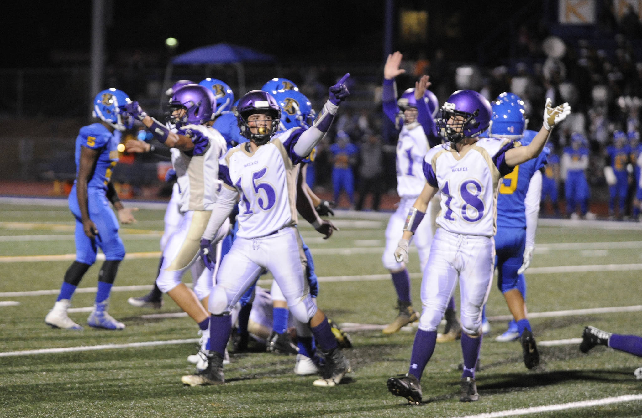 The Knights looked to get within a score as the third quarter waned, but were forced to punt at about midfield — and that’s when Sequim senior Kyler Rollness gave the Wolves a special teams jolt. Picking up the punt after a rugby-style kick, Rollness weaved and dodged 95 yards for a touchdown and a 34-14 lead.