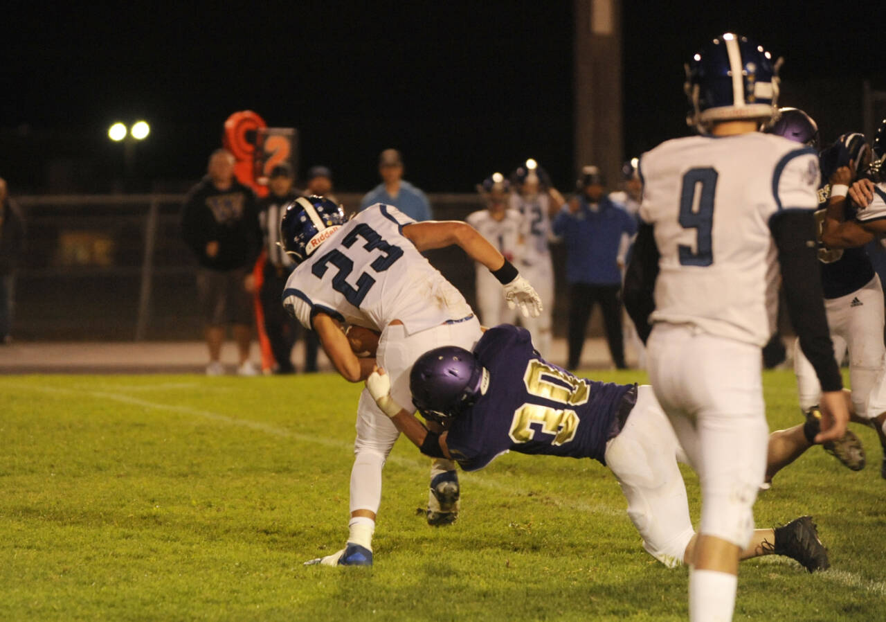 Sequim Gazette photo by Michael Dashiell / Sequim’s Sam Shinkle (30) makes a stop on a North Mason running back in the Wolves’ 36-0 shutout of the Bulldogs on Oct. 13. Shinkle made the transition from lineback to defensive tackle and had a big game, with two tackles for losses and a sack.
