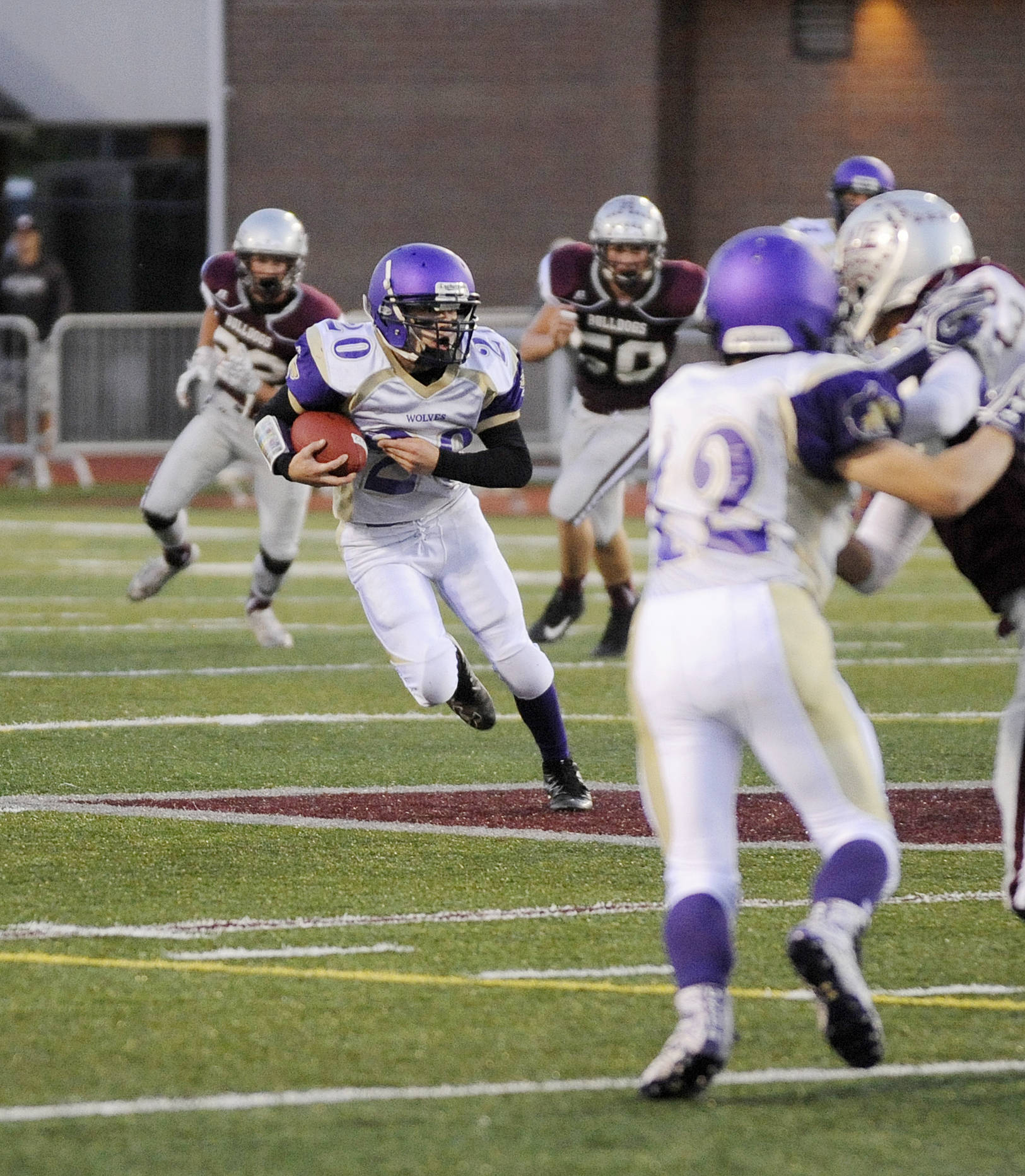 Sequim running back Hayden Gresli breaks free for yardage. Gresli led the Wolves with 43 rushing yards in a 41-6 loss on Sept. 8. Sequim Gazette photo by Michael Dashiell