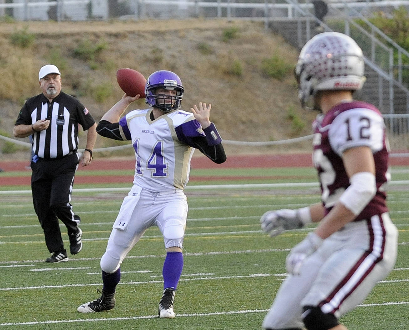 SHS quarterback Riley Cowan looks for a receiver downfield in the first quarter of the Wolves’ Sept. 8 game at Montesano. Sequim Gazette photo by Michael Dashiell