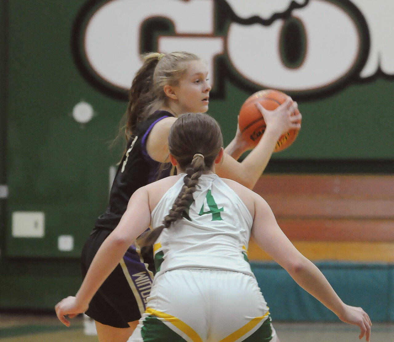 Sequim’s Jolene Vaara, right, looks to take the ball from Lynden’s Haylee Koetje in the first half of the Wolves’ 50-26 loss in a state regional playoff game on Feb. 25 in Mount Vernon. Sequim Gazette photo by Michael Dashiell