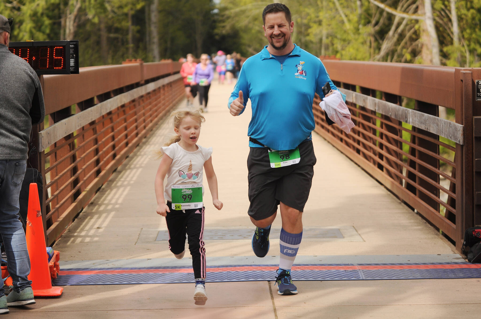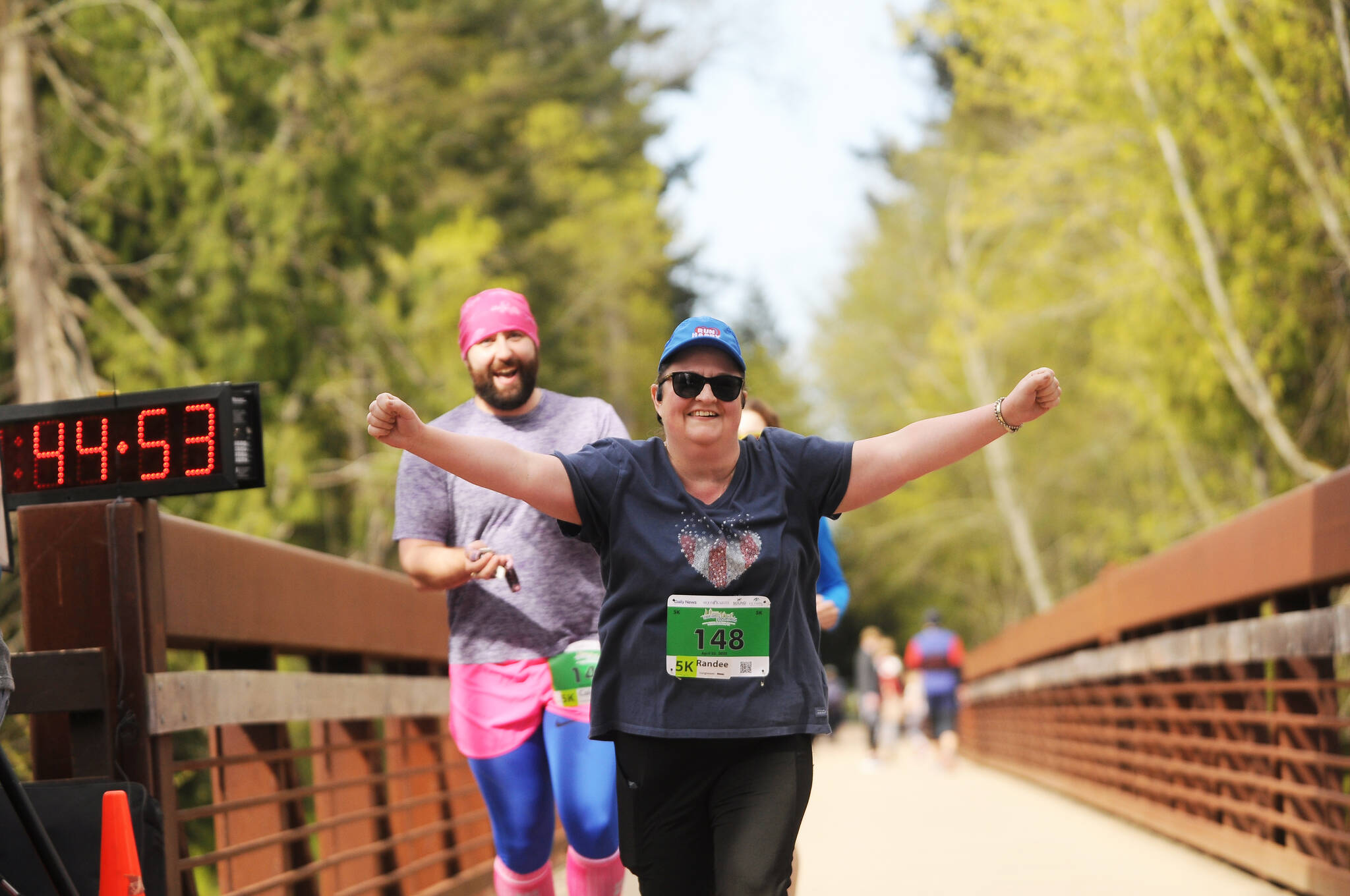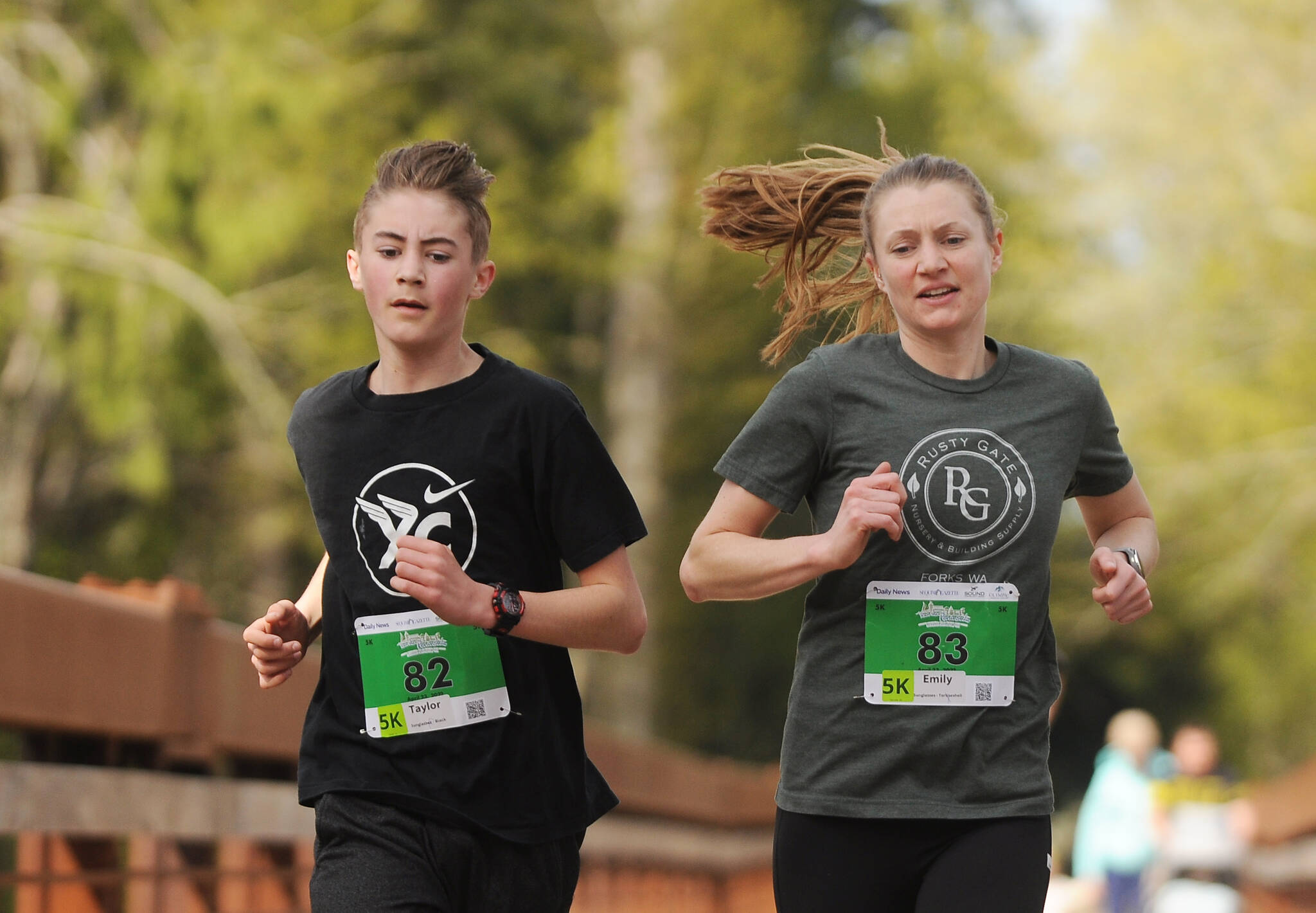 She said a number of volunteers were on hand to make the Sequim race happen, including members of the Port Angeles High School football team (handing out medals) and Olympic Discovery Trail volunteers (course helpers).