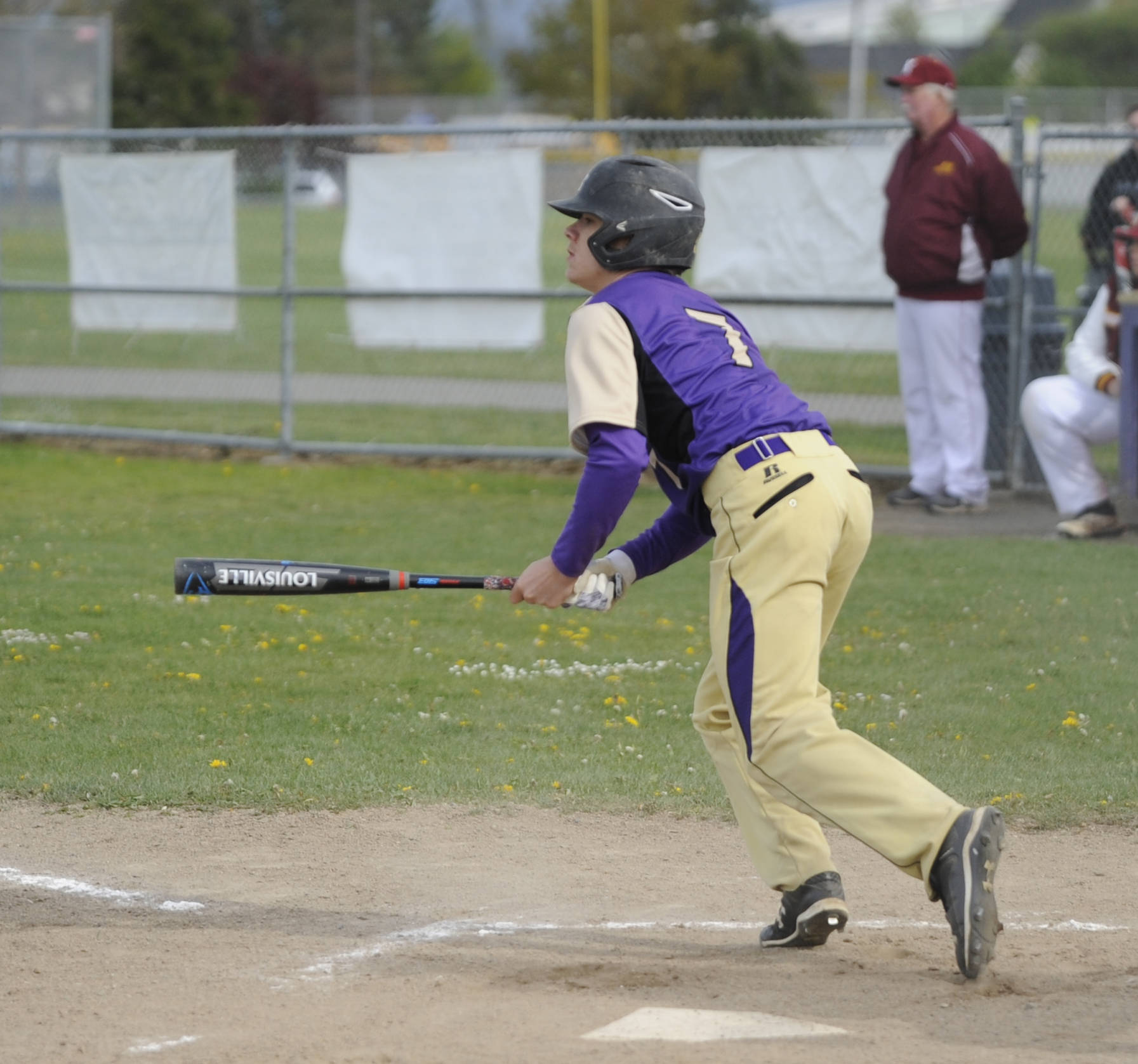 Sequim High’s Silas Thomas rips a single to center field in the Wolves’ Olympic league win over Kingston on in April 2019. The all-Olympic League second team outfielder figured to lead the Wolves’ pitching rotation in 2020. Sequim Gazette file photo by Michael Dashiell