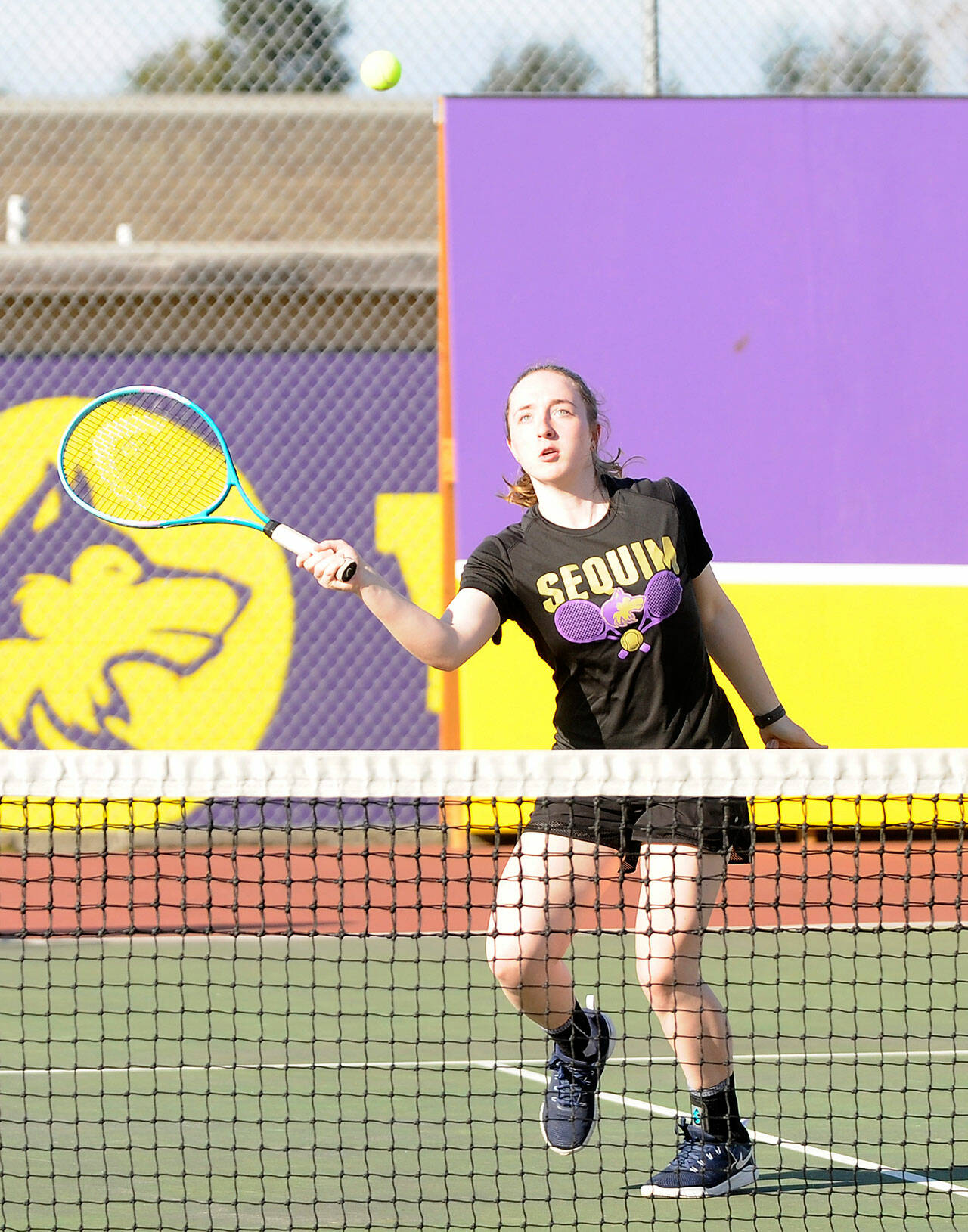 Sequim's Jordan Hegtvedt returns a shot as she and doubles teammate Malory Morey sweep North Mason's Emma Hunt and Ava Oldright 6-0, 6-1, on March 22. District tourney qualifiers this spring, both players were named to the all-Olympic League list. Sequim Gazette file photo by Michael Dashiell