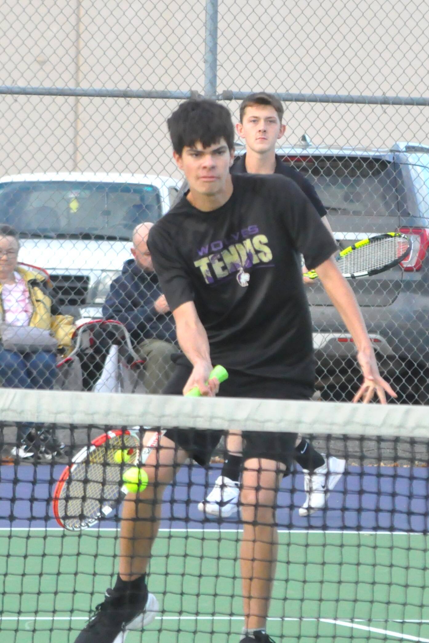 The Wolves’ No. 2 singles player Josh Loucks won in two sets 6-0, 6-1 over Ben Giesa, while No. 3 singles player Wyatt Perez also won in two sets over William Hemlich 6-1, 6-2.