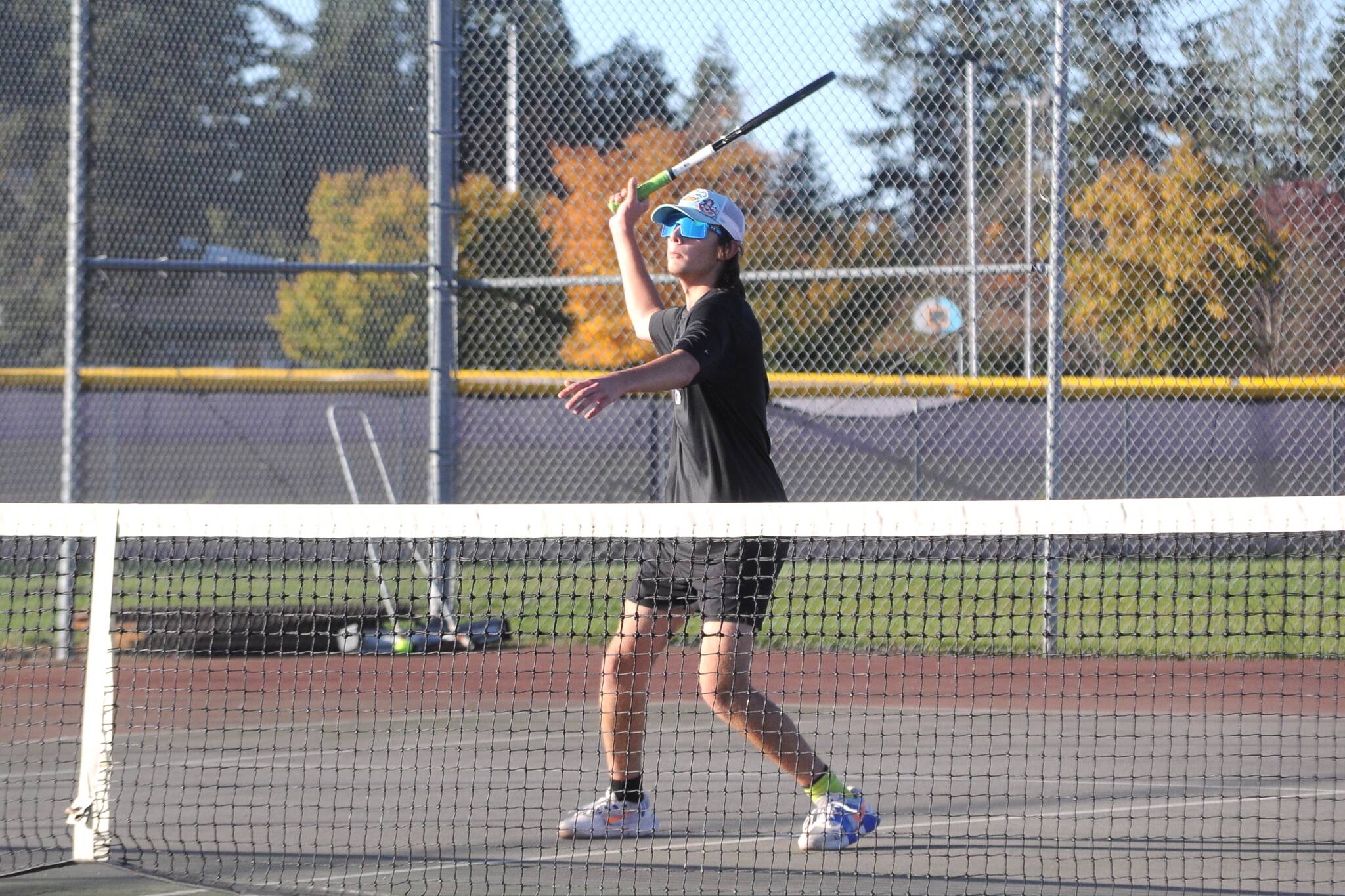 Sequim Gazette photo by Matthew Nash/ Bjorn Henrickson returns a hit in a match with partner Mason Rapelje, not pictured, Oct. 15 against Kingston’s No. 1 doubles team.