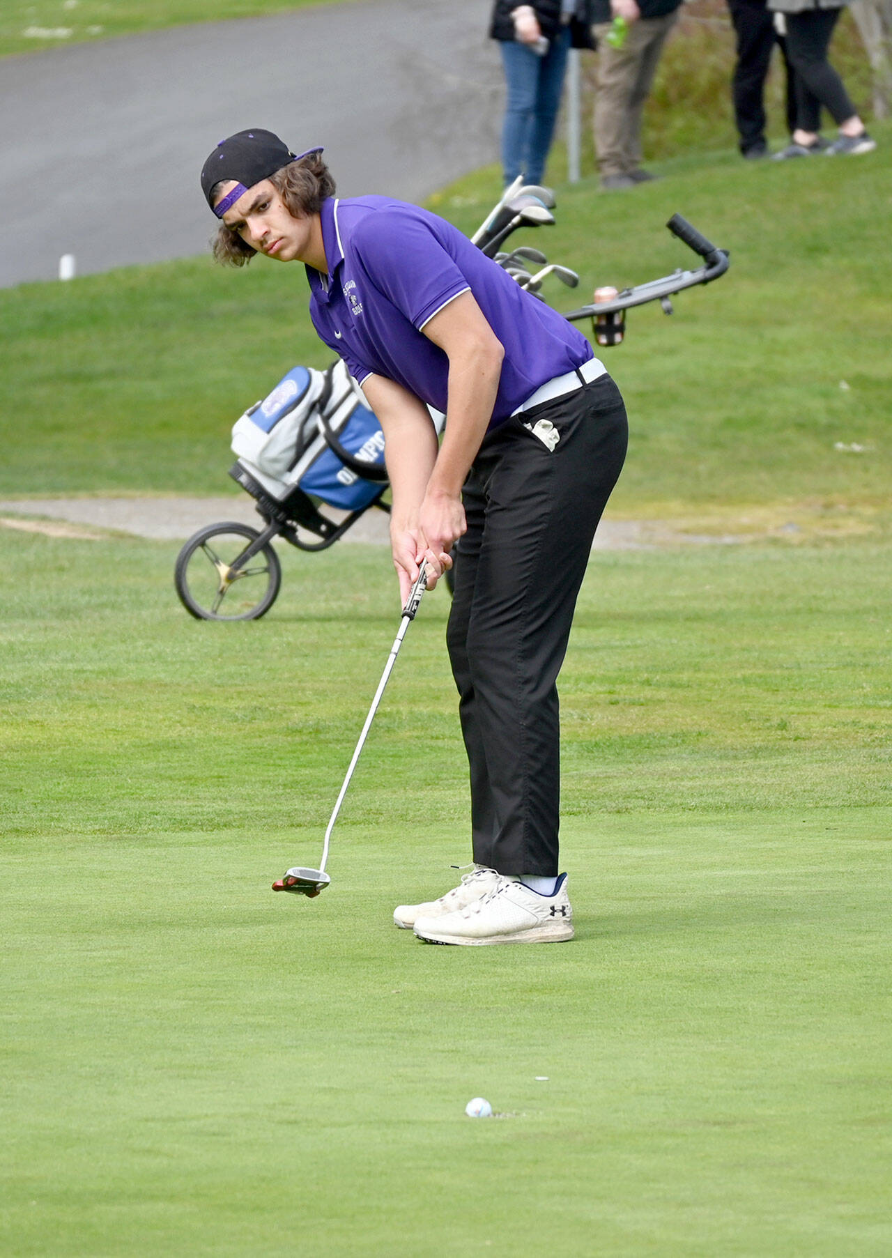 Sequim Gazette file photo by Michael Dashiell / Sequim’s Lars Wiker putts during a match against Olympic at The Cedars at Dungeness in 2023.