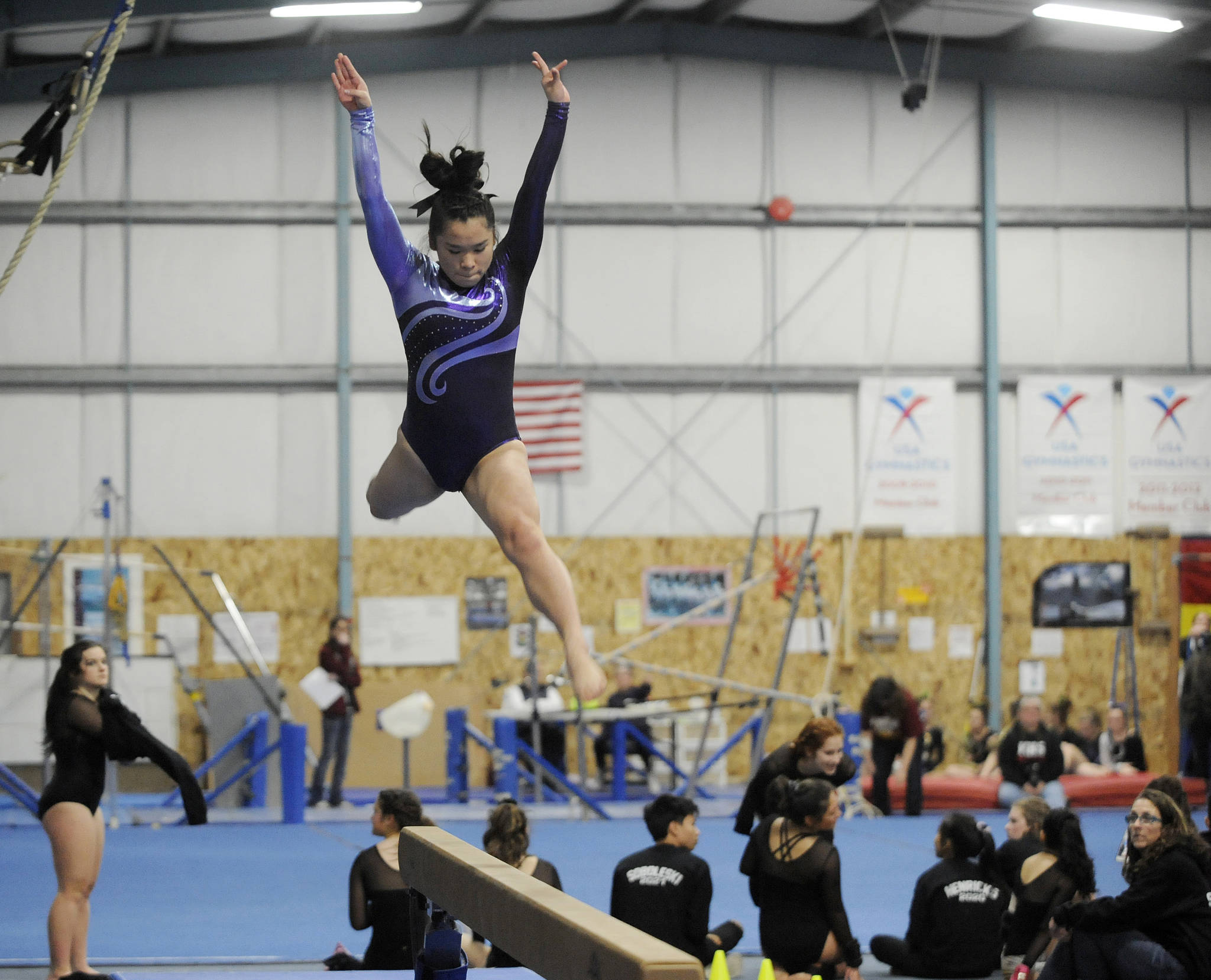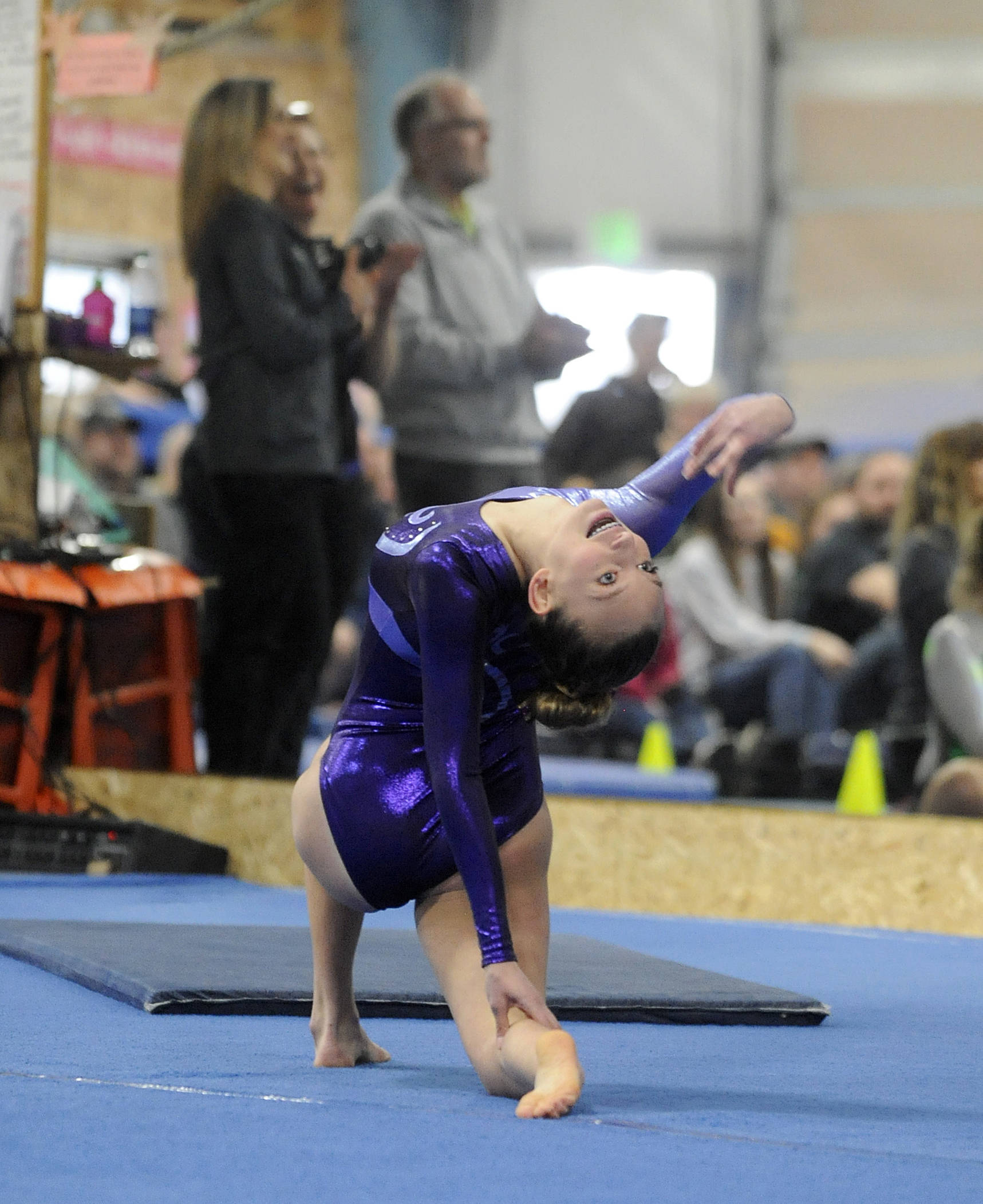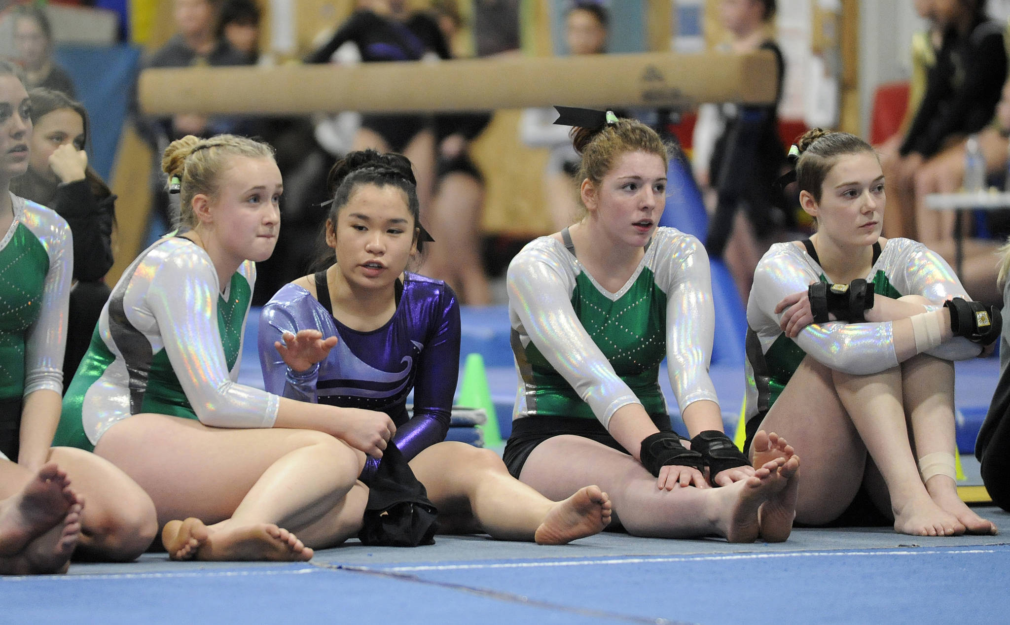 That cross-peninsula rivalry doesn’t apply here. In Sequim purple or Port Angeles green, they are enduring the twists and turns of the prep gymnastics season together.