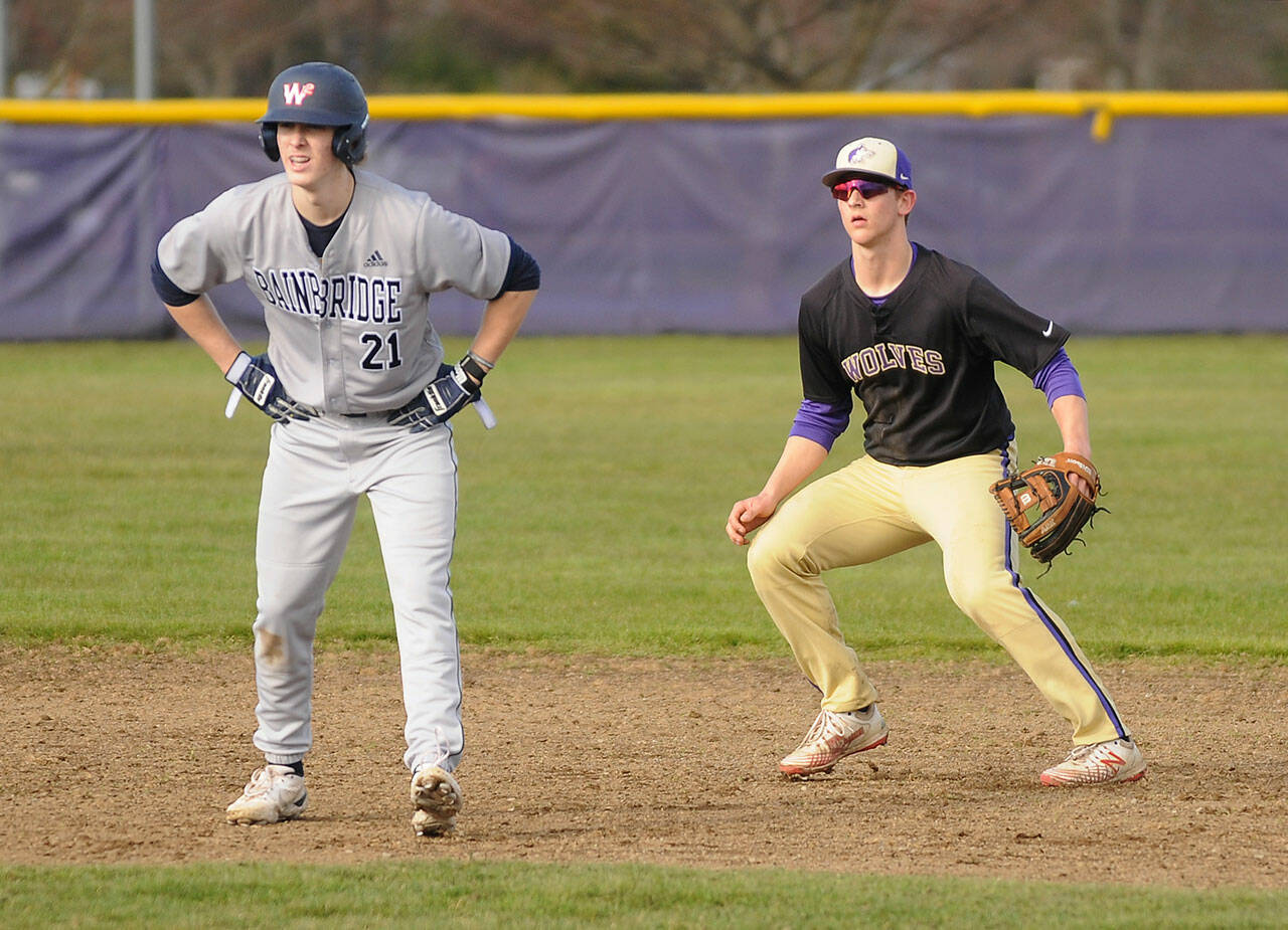Sequim shortstop Conor Bear puts the tag on a Bainbridge runner in the first inning of the Wolves’ league match with with the Spartans on March 15. Teammates Jaxson Gray (foreground) and Marshall Phipps look on. Sequim Gazette photo by Michael Dashiell
